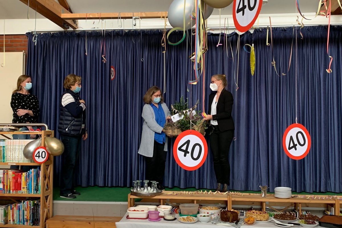 Es stand ein ganz besonderer Tag in der Grundschule Borgstedt an. Nein, es war nicht der Zeugnistag, auch kein Geburtstag und auch nicht der letzte Schultag vor den Ferien. Es war das 40. Dienstjubiläum unserer Frau Haase. Seit 40 Jahren ist sie nun schon Lehrerin und wer glaubt, dass Frau Haase nach so langer Zeit keine Lust mehr auf den Beruf hat, der kennt unsere Frau Haase nicht. Sie geht ihrem Beruf noch immer mit so viel Herzblut und Freude nach, dass Sie unseren Schulalltag jeden Tag aufs Neue in ganz besonderem Maße bereichert und für das gesamte Kollegium ein Vorbild ist. So ein Dienstjubiläum für so eine besondere Lehrerin und Kollegin musste natürlich auch besonders gewürdigt werden. Sprechchöre in der großen Pause, die in ganz Borgstedt zu hören waren, feierliche Worte von der Schulleitung und vom Schulverband sowie eine festlich geschmückte Aula und ein gemütliches Beisammensein im Kollegium brachten Frau Haase zum Staunen.
