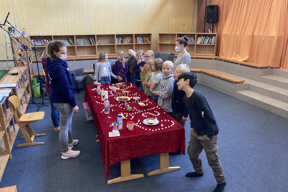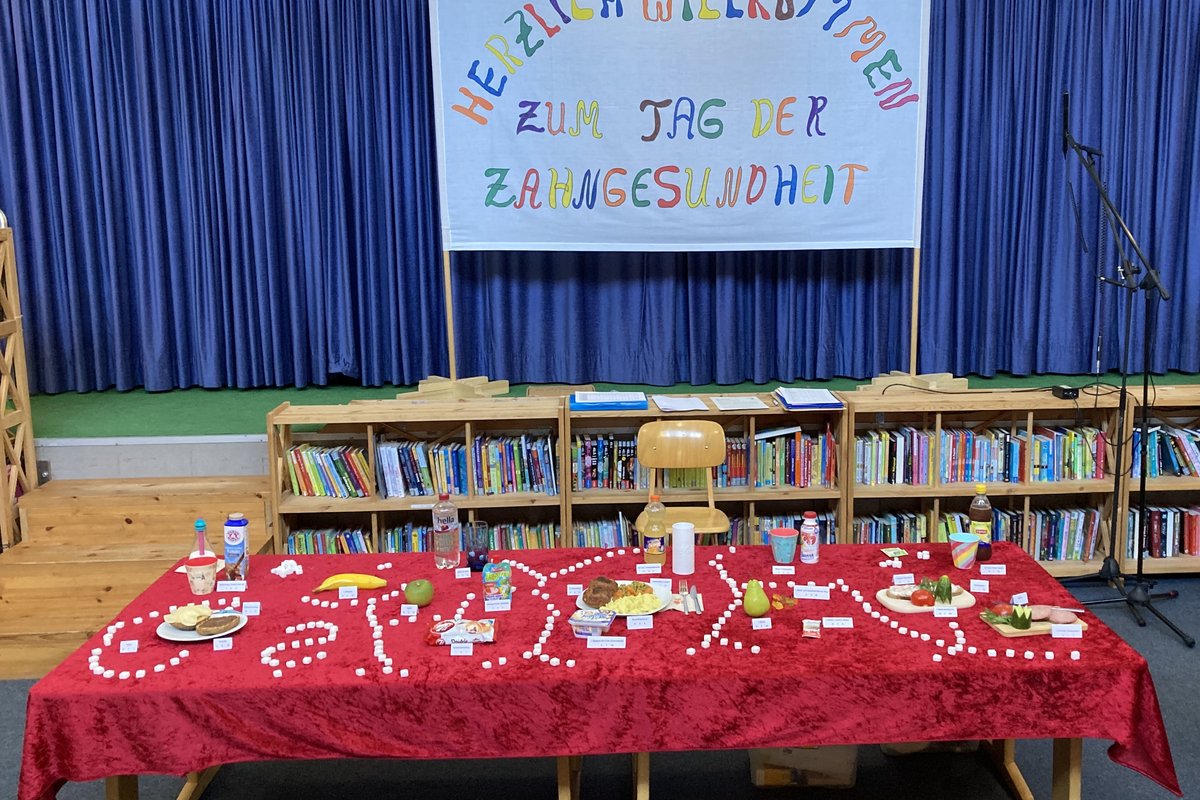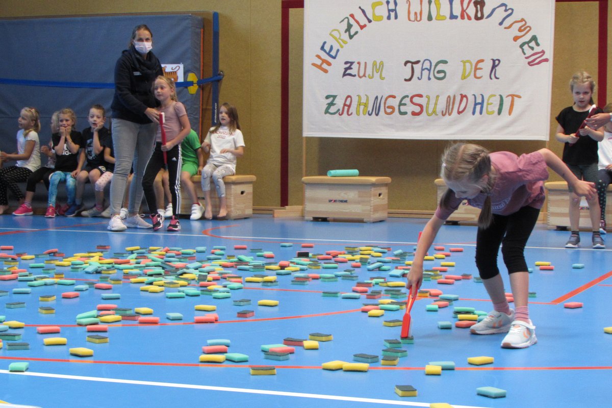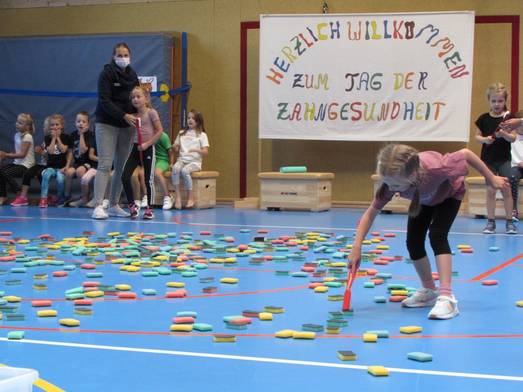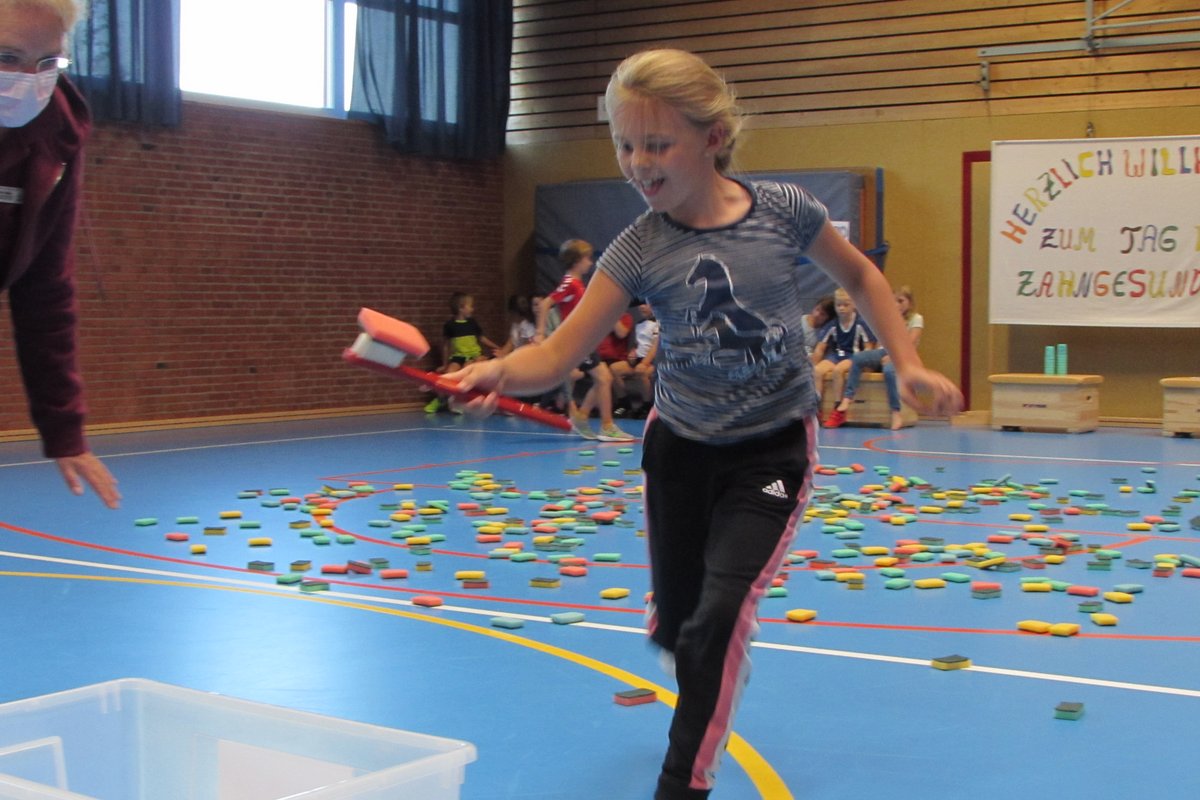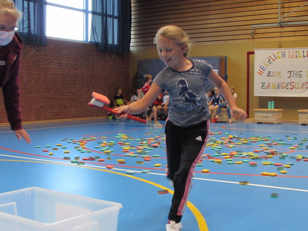 Die Grundschule Borgstedt war in diesem Jahr Ort der „Aktionstage der Zahngesundheit“. So fand die Zahnprophylaxe nicht wie sonst im Klassenraumstatt, sondern die gesamte Schule stand drei Tage lang im Zeichen der Zahngesundheit. Frau Rutz und ihr Team hatten in der Aula einen großen „Zuckertisch“ aufgebaut, an dem die Kinder schätzen konnten, wie viele Stücke Zucker in unterschiedlichen Lebensmitteln versteckt sind und in der Turnhalle und beim Bingo-Spiel ging es rund um die Zahngesundheit heiß her! Abschließend wurden die Kinder mit an Bord eines Piratenschiffs genommen und weil sie alle kniffligen Fragen, die dort gestellt wurden, richtig beantworteten, öffnete sich zum Schluss eine Schatztruhe voller bunter Zahnputzbecher, die gefüllt waren mit Zahnbürste, Zahnpasta und einer Sanduhr.