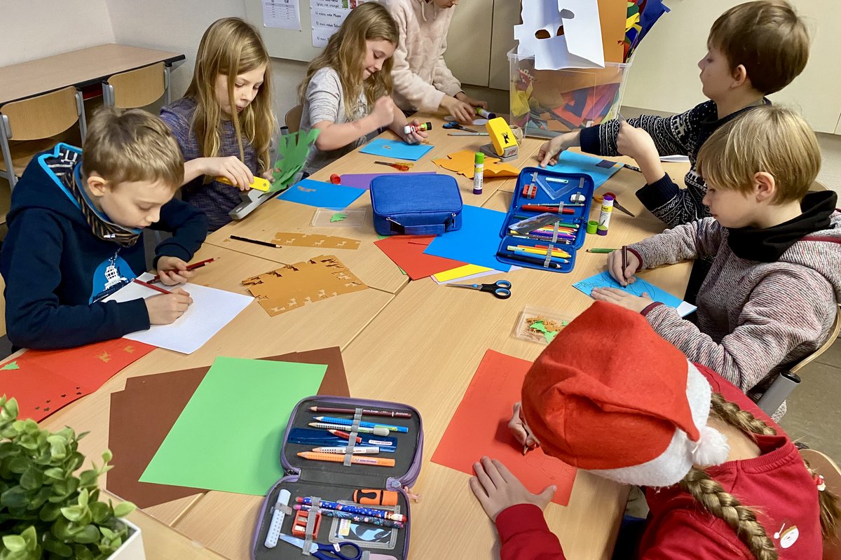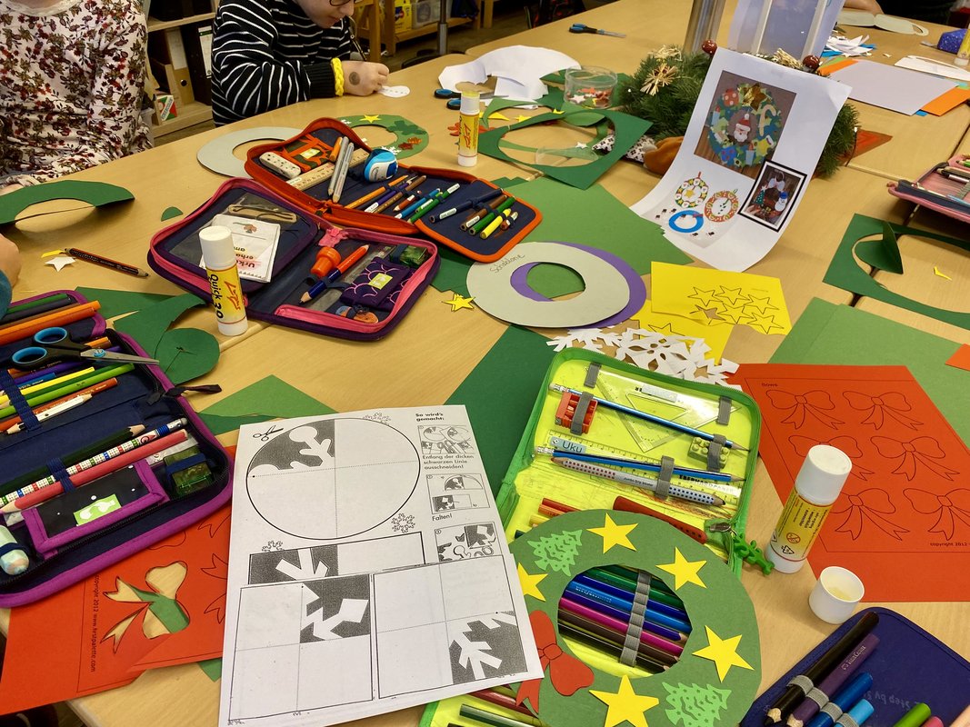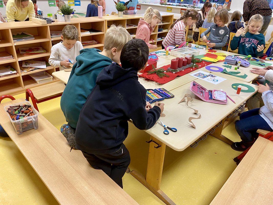 Danach ging es in die Klassenräume zum Basteln. Durch die tatkräftige Unterstützung zahlreicher Eltern erstrahlen die Schulfenster nun in fröhlichen Weihnachtsmotiven.