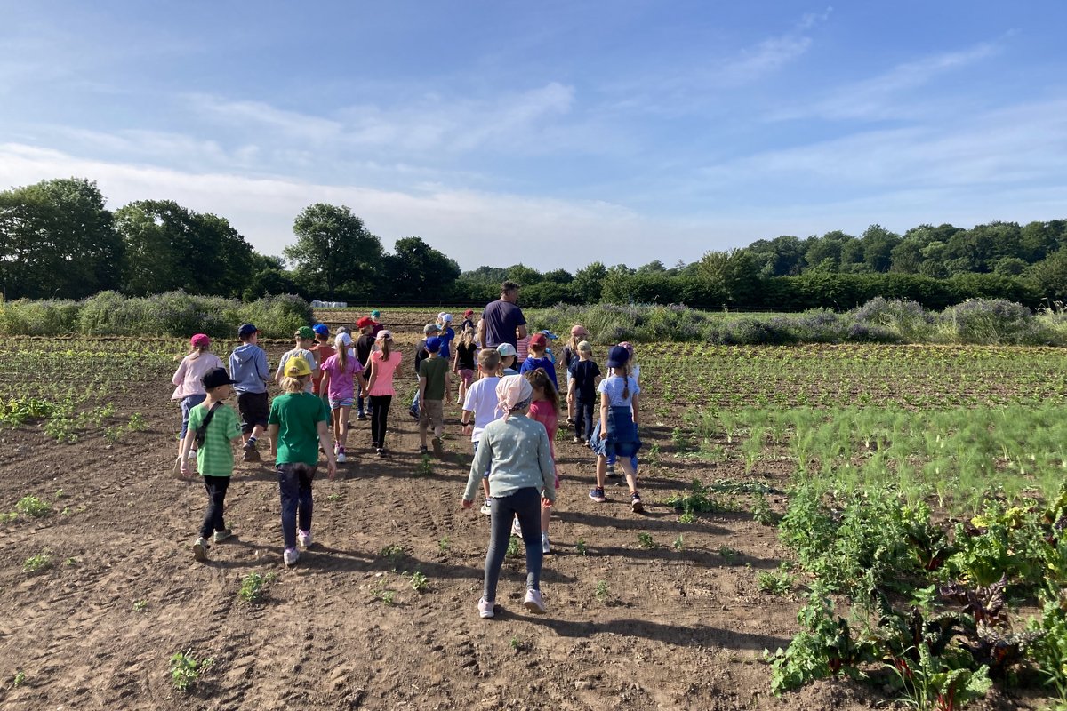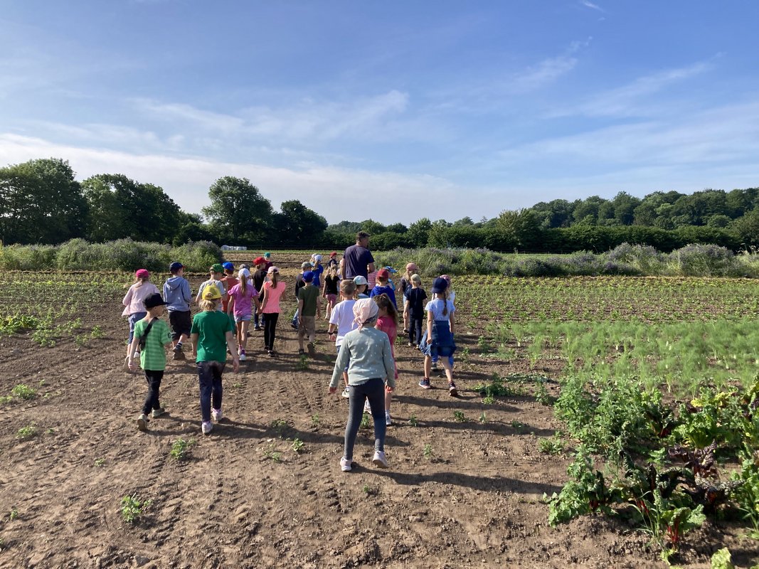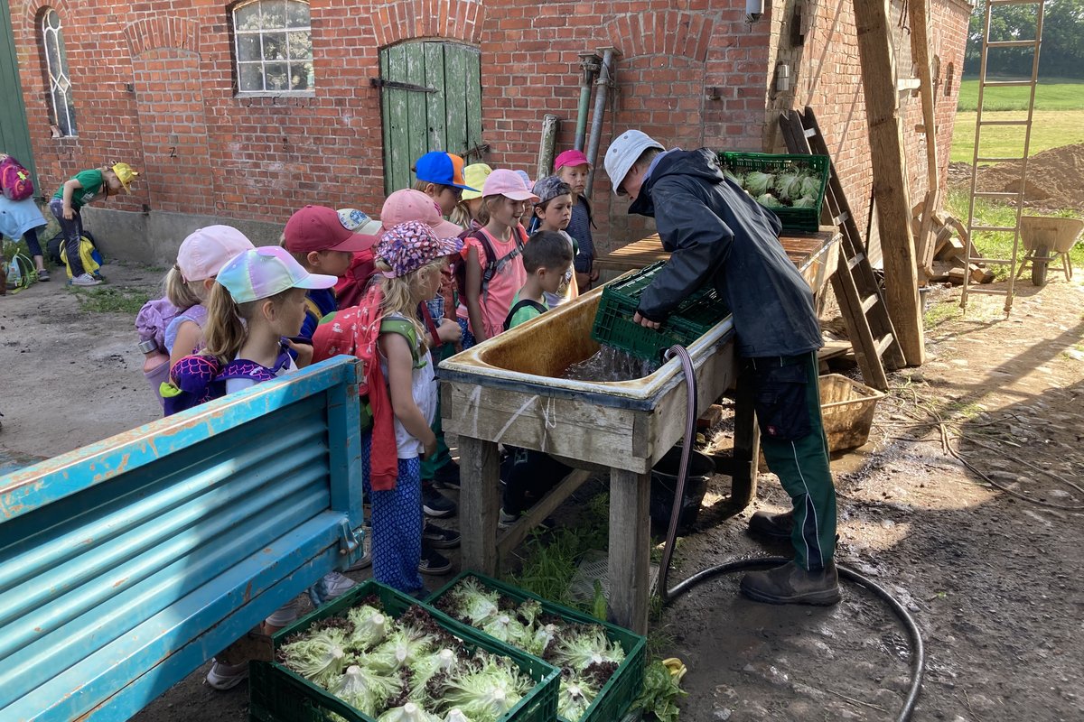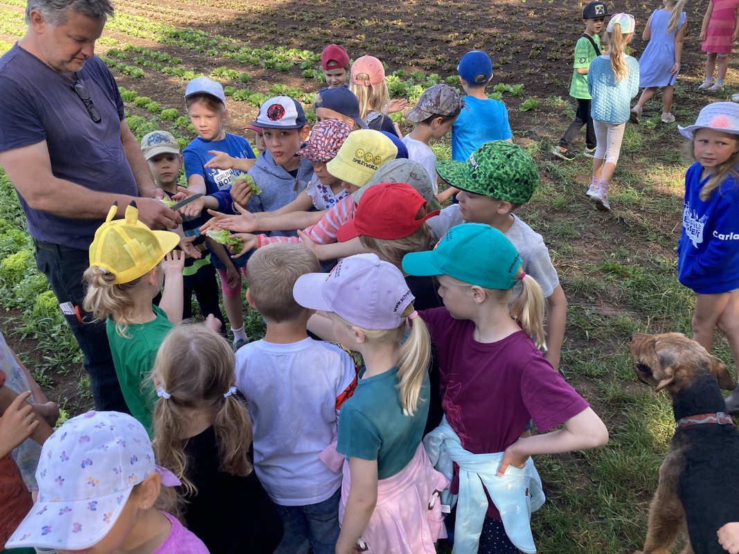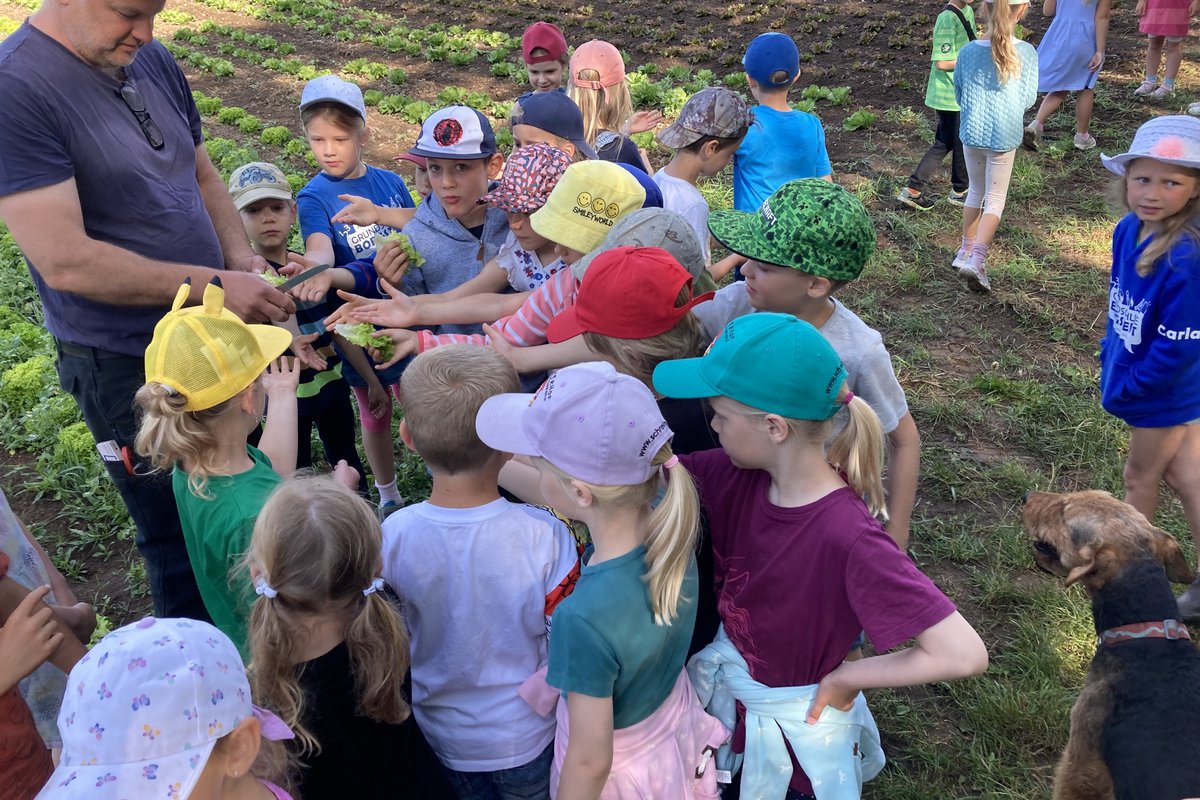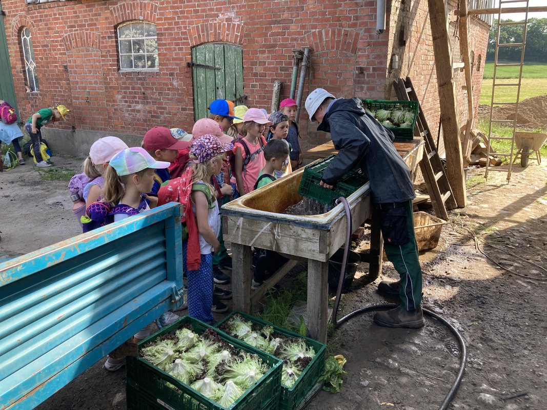 Jeden Montag bringt der Wischhof für jede Klasse eine Kiste mit frischem Obst und Gemüse in die Grundschule Borgstedt, damit alle Kinder eine Extraportion gesundes Essen zum Frühstück genießen können. Gefördert wird dieses Projekt von der Europäischen Union und umgesetzt wird es vom Team des biologischen Bauernhofs in Sehestedt. Die Kinder der 1. Klasse wollten genau wissen, wo das leckere Obst und Gemüse herkommt und so sahen sie sich den Hof mal genauer an. Sie verbrachten einen spannenden Vormittag dort! Bei der Erkundung des Geländes erzählte Bauer Manz von seinem Beruf und beantwortete unzählige Fragen. Dabei verteilte er ganz viele Kostproben, die er frisch vom Feld erntete. Danke für diesen interessanten und köstlichen Tag!