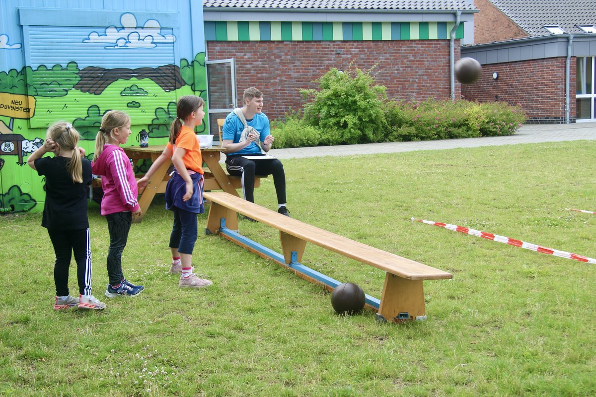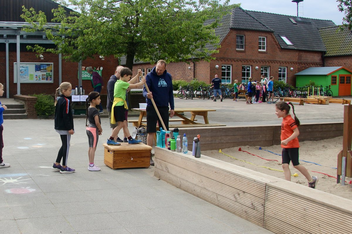 Heute ging es mal wieder besonders sportlich zu in der Grundschule Borgstedt: Der Kindermehrkampf stand an. Das Wetter meinte es gut mit uns, sodass die Kinder auf dem gesamten Außengelände an elf verschiedenen Stationen zeigen konnten, was in ihnen steckt. Nach einer gemeinsamen Erwärmung ging es auch schon los: In bunt gemischten Teams traten nicht nur die Grundschulkinder an, sondern auch die Vorschulkinder, die nach den Sommerferien eingeschult werden.