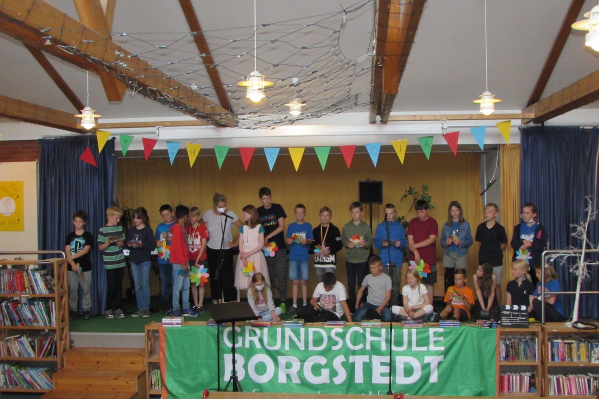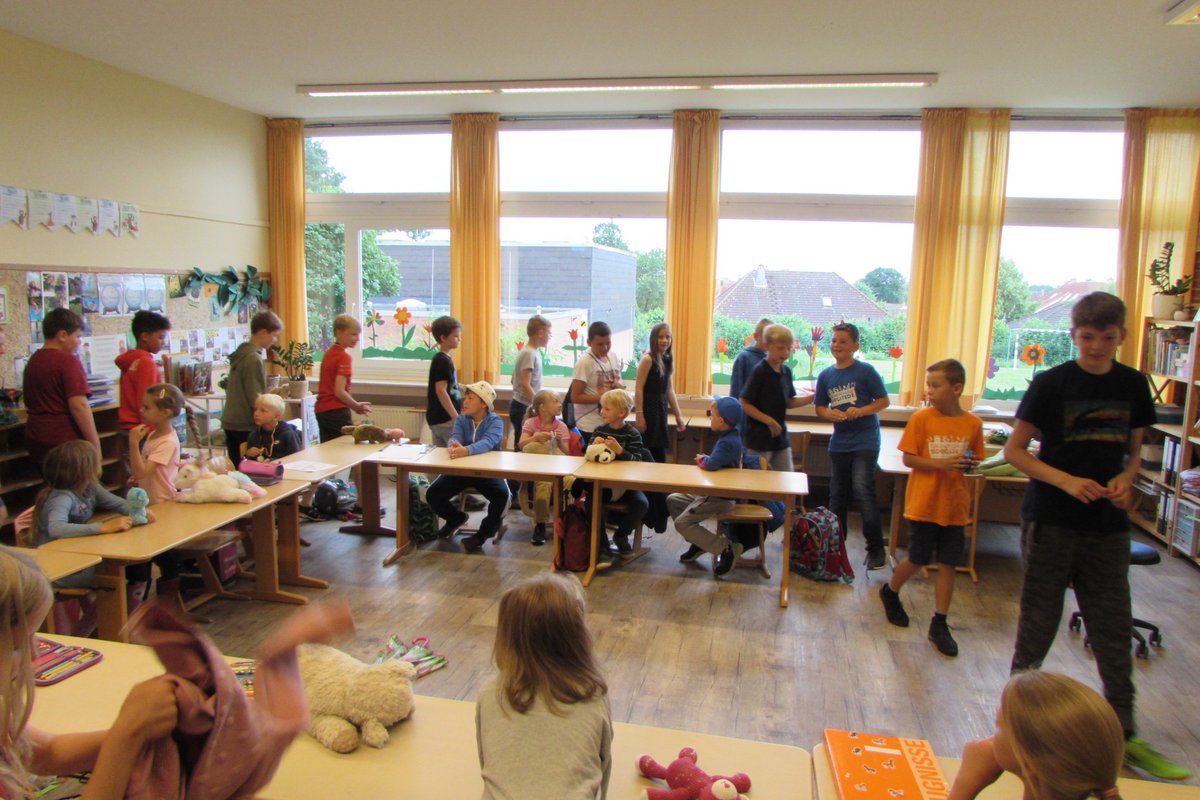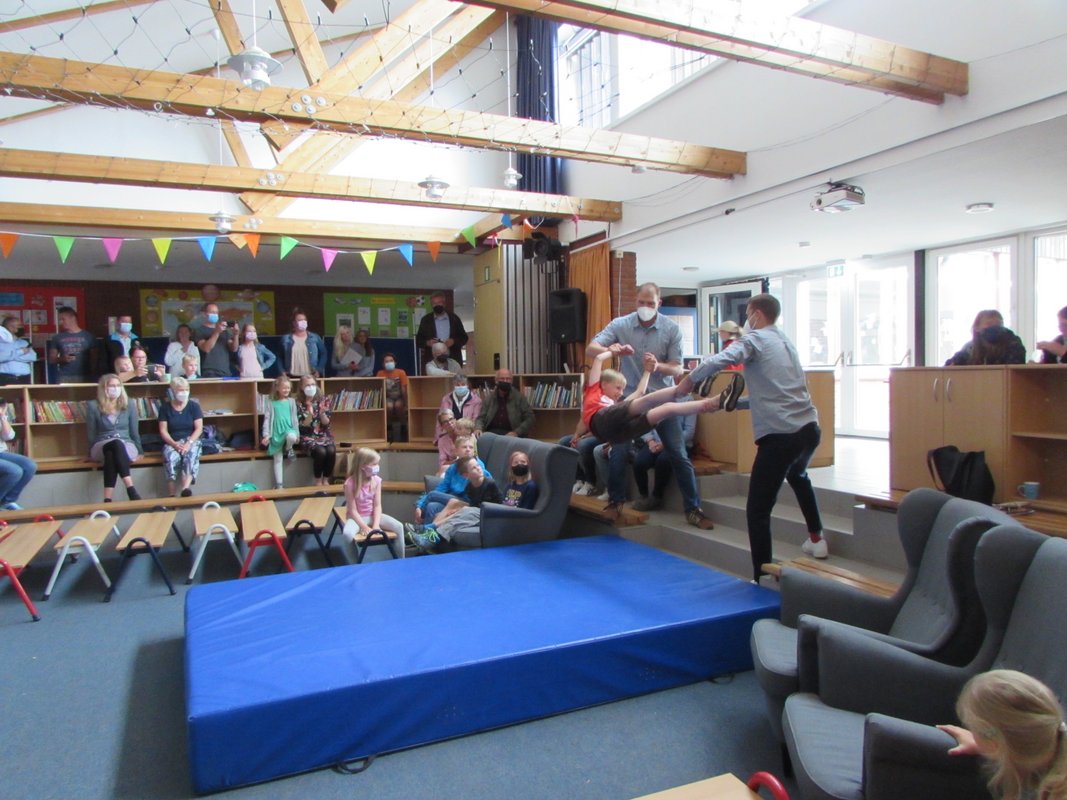 Das Schuljahr ist vorbei! Doch bevor alle in die wohlverdienten Sommerferien starteten, erhielten die Kinder ihre Kraftblätter. Die Kraftblätter sind die Zeugnisse, in die die Kinder viel Kraft, Fleiß und Einsatz gesteckt haben und die ihnen viel Kraft geben, weil sie zeigen, was die Kinder alles können. Am Ende des Tages mussten wir uns dann auch von unserer 4. Klasse verabschieden. Es begann mit einem Reifenspalier durch die gesamte Schule, das in die Aula führte, wo die gesamte Schule die Viertklässlerinnen und Viertklässler lautstark feierte und mit guten Wünschen für die weiterführenden Schulen ausstattete. Die Klassen 1 und 2 gingen anschließend fröhlich in die Ferien und machten Platz für die Eltern unserer Dubbelbubbel. Nach Abschiedsworten, Theater und zwei Musikauftritten von Klasse 3, zeigten die Dubbelbubbel in einem bunten Programm, was sie alles können und verabschiedeten sich außerdem noch mit vielen verschiedenen Grüßen in einem Video von der Schule. Am Ende erfolgte der Rausschmiss in der Aula: Die Dubbelbubbel flogen unter großem Applaus in hohem Bogen aus der Schule. Wir wünschen euch einen guten Start an euren neuen Schulen!