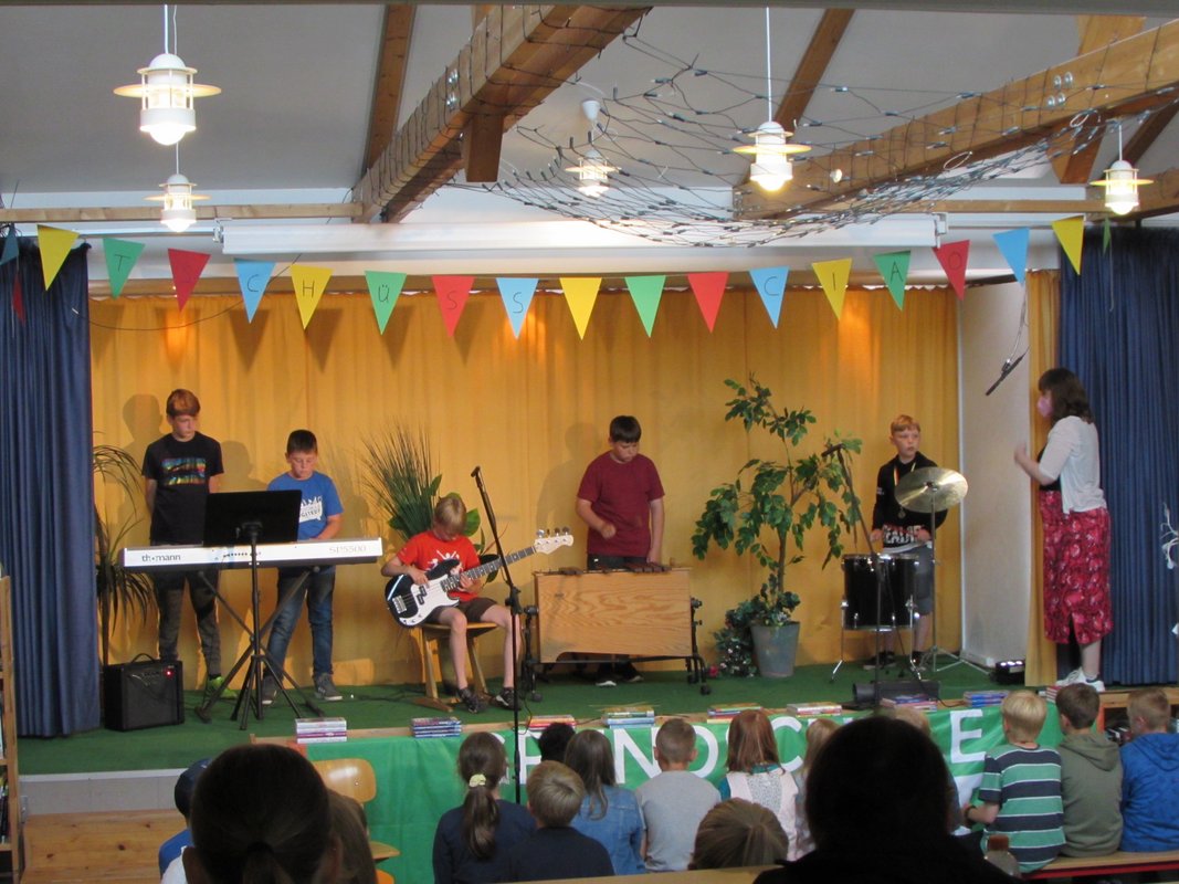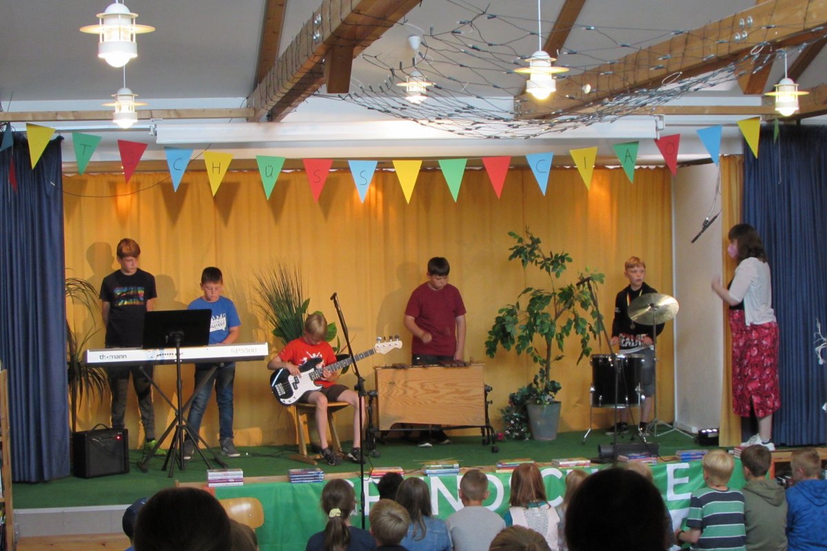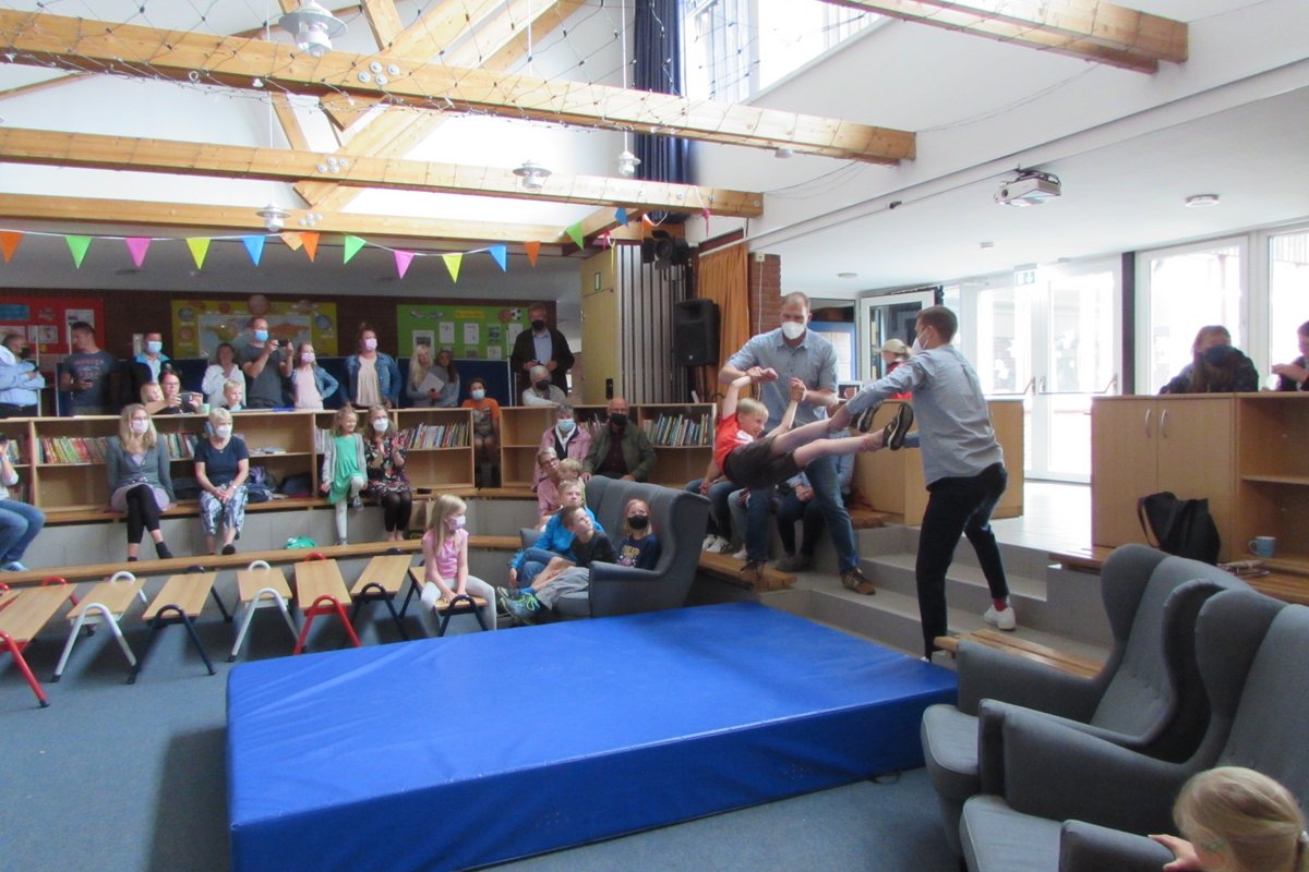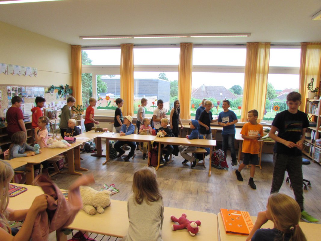 Das Schuljahr ist vorbei! Doch bevor alle in die wohlverdienten Sommerferien starteten, erhielten die Kinder ihre Kraftblätter. Die Kraftblätter sind die Zeugnisse, in die die Kinder viel Kraft, Fleiß und Einsatz gesteckt haben und die ihnen viel Kraft geben, weil sie zeigen, was die Kinder alles können. Am Ende des Tages mussten wir uns dann auch von unserer 4. Klasse verabschieden. Es begann mit einem Reifenspalier durch die gesamte Schule, das in die Aula führte, wo die gesamte Schule die Viertklässlerinnen und Viertklässler lautstark feierte und mit guten Wünschen für die weiterführenden Schulen ausstattete. Die Klassen 1 und 2 gingen anschließend fröhlich in die Ferien und machten Platz für die Eltern unserer Dubbelbubbel. Nach Abschiedsworten, Theater und zwei Musikauftritten von Klasse 3, zeigten die Dubbelbubbel in einem bunten Programm, was sie alles können und verabschiedeten sich außerdem noch mit vielen verschiedenen Grüßen in einem Video von der Schule. Am Ende erfolgte der Rausschmiss in der Aula: Die Dubbelbubbel flogen unter großem Applaus in hohem Bogen aus der Schule. Wir wünschen euch einen guten Start an euren neuen Schulen!