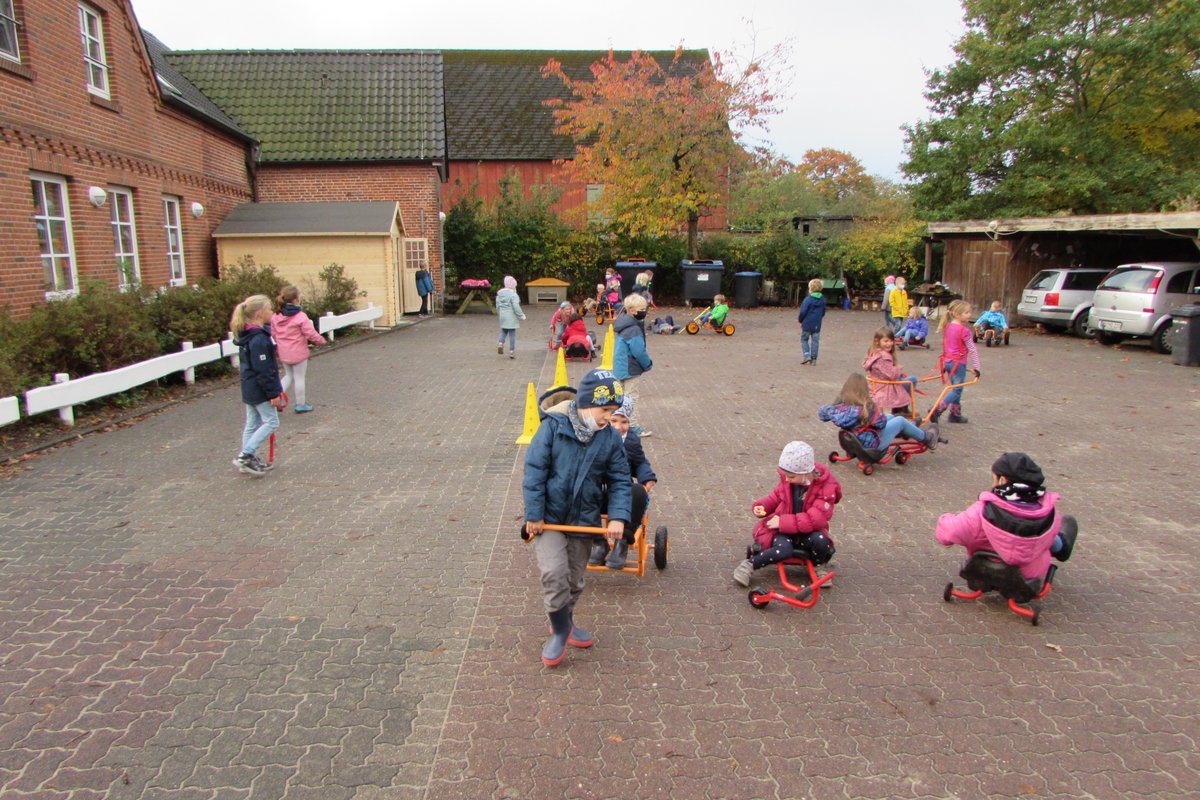 Auf was freuen sich Kinder in der Schule am meisten? Auf die Pausen! Und noch mehr Freude bereiten die Pausen, wenn es auf dem Schulhof viel Platz und Anlässe zum Spielen gibt. Hier in Borgstedt gibt es nun viele neue solcher Anlässe. Auf dem Gelände des ehemaligen Hausmeistergartens warten eine lang ersehnte Schaukelanlage und ein Seilparcour auf die Kinder. Das alte Klettergerüst, welches schon 30 Jahre auf dem Buckel hatte, durfte in den wohlverdienten Ruhestand gehen. An gleicher Stelle steht nun ein Klettergerüst mit drei Türmen und jeder Menge Möglichkeiten zum Hangeln, Rutschen und Klettern. Heiß her geht es auch auf unserer Pflasterfläche: hier herrscht ein wuseliges Treiben mit verschiedenen Fahrgeräten, Rikschas und Trikes. Wenn das so weitergeht, wird in Zukunft nicht nur vor der Schule, sondern auch auf dem Schulgelände geblitzt. In den ersten Tagen wurden alle Geräte auf Herz und Nieren von den Kindern getestet und für sehr gut befunden. Dem ersten Ansturm haben sie standgehalten
