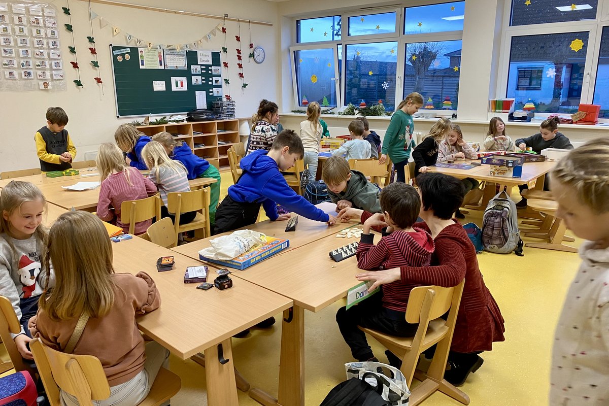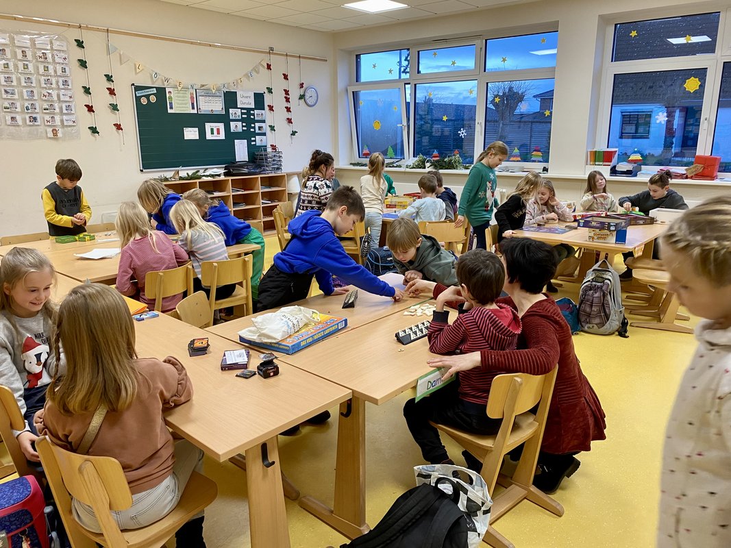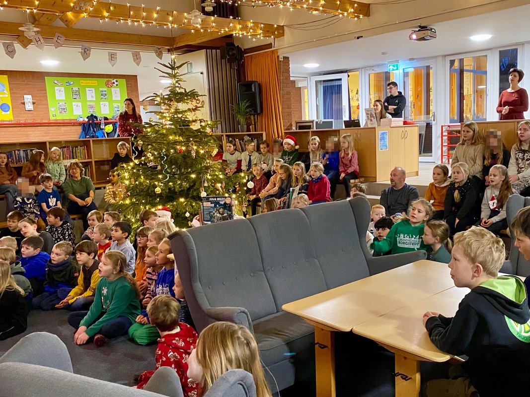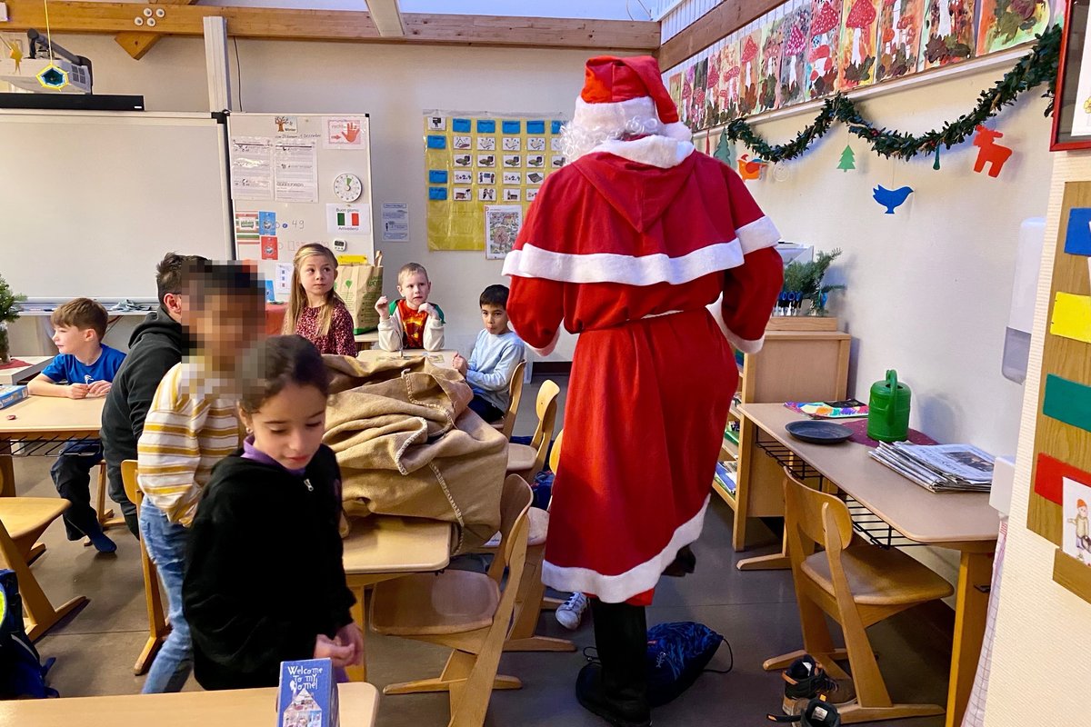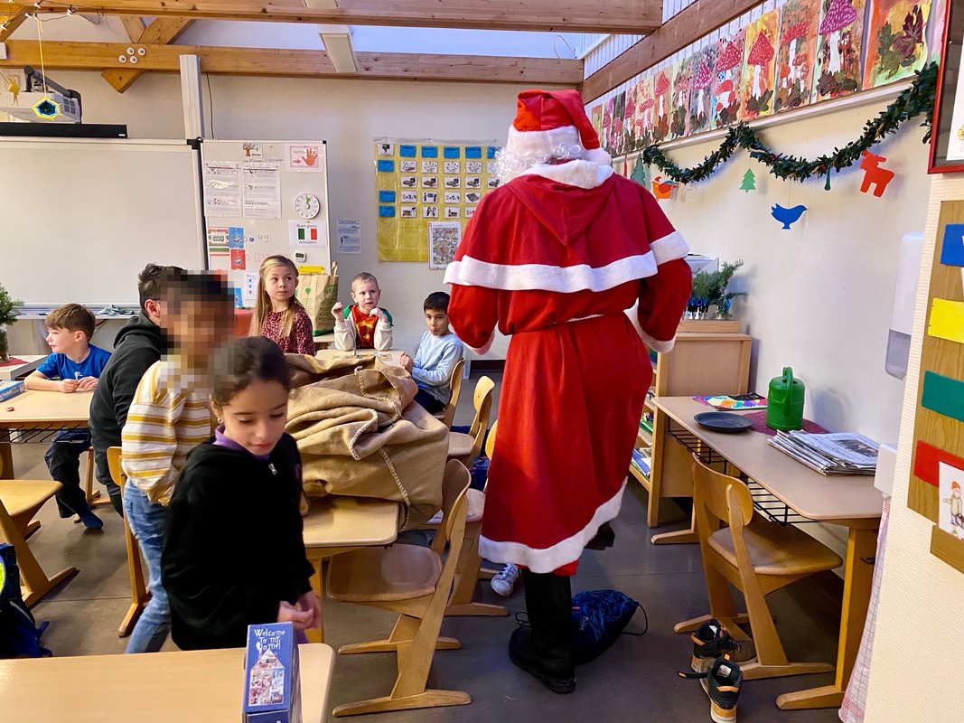 Der Tag startete mit einem musikalischen Auftakt in der Aula. Mit der Unterstützung einiger Kinder wurden weihnachtliche Musikstücke aufgeführt und gemeinsam gesungen. Danach ging es in die Klassen. Dort wurde gespielt, bis es an der Tür klopfte und der Weihnachtsmann uns besuchte. Es wurden Gedichte aufgesagt und kleine Aufmerksamkeiten verteilt.